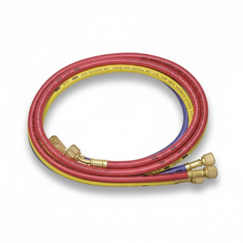 - Set de 3 Colores Estándar: Incluye mangueras en rojo, azul y amarillo para una gestión visual clara de las líneas de alta, baja y servicio durante los procesos de carga y recuperación.