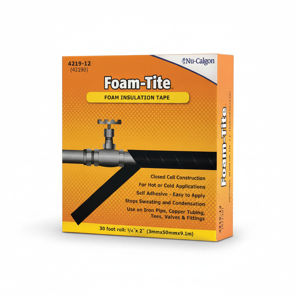 Asegure la eficiencia de sus instalaciones con la Cinta de Espuma Aislante Foam-Tite de Nu-Calgon (Modelo 4219-12). Esta cinta premium de 30 pies de largo y 2 pulgadas de ancho ofrece una barrera térmica superior para líneas de succión, tuberías de agua fría y componentes de refrigeración, siendo esencial en los climas de Baja California.